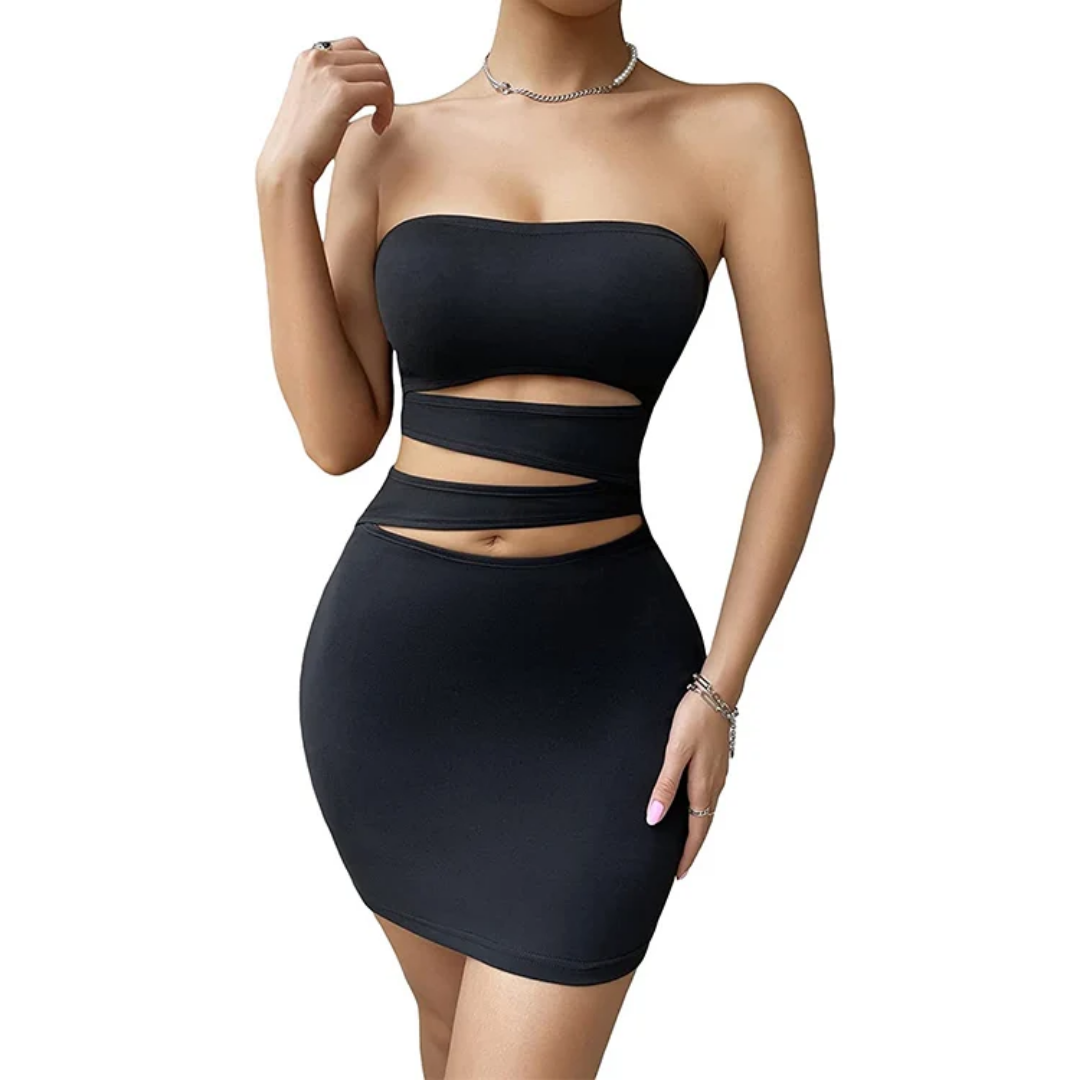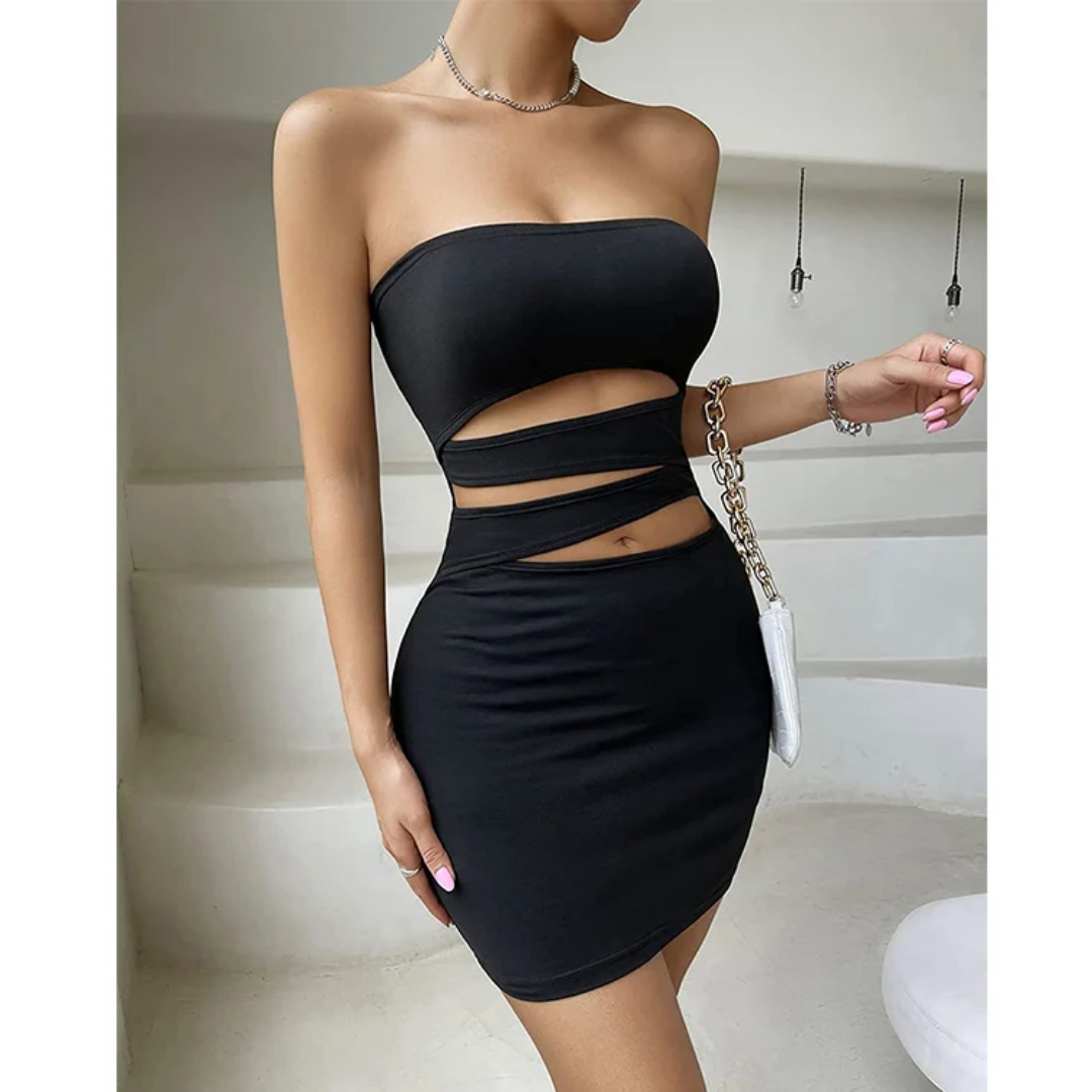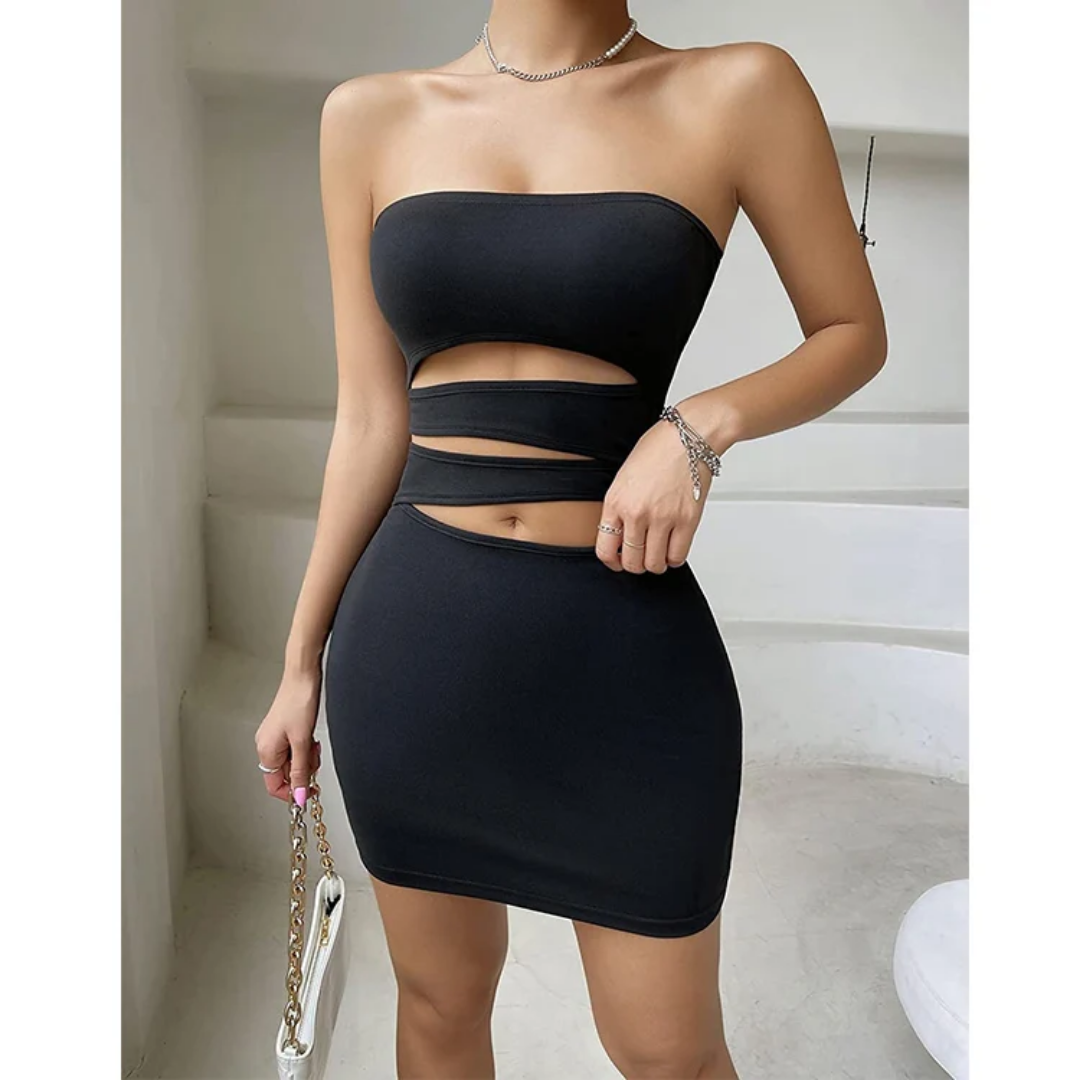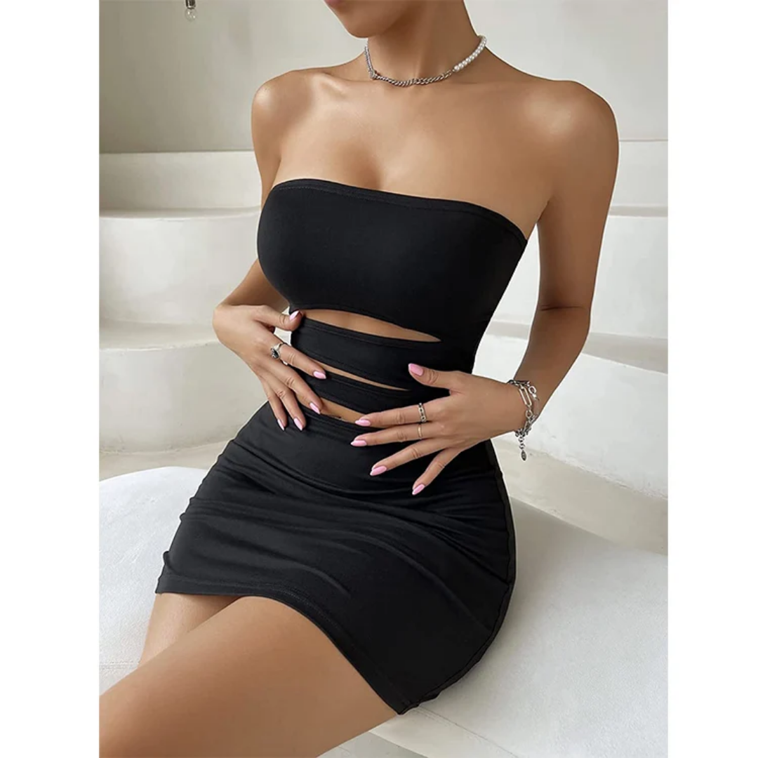 Vestido mini ajustado tipo strapless, con aberturas cut-out y bandas cruzadas en la cintura.